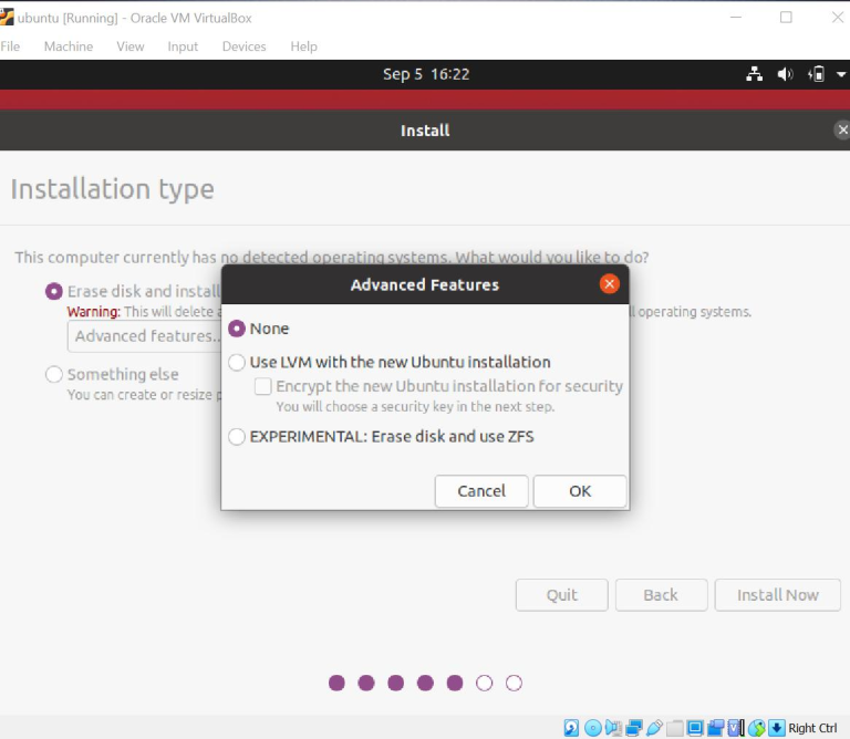 Disini diberikan tiga opsi pilihan antara menggunakan LVM , experimental, dan tidak menggunakan keduanya. Disini saya memilih pilihan default dan klik ok.