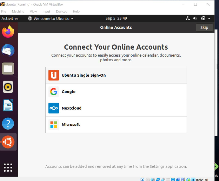 Disini anda bisa memilih akun mana yang ingin dikonekasikan dengan ubuntu. Jika anda tidak ingin terhubungdengan akun anda, maka cukup klik skip untuk lanjut.