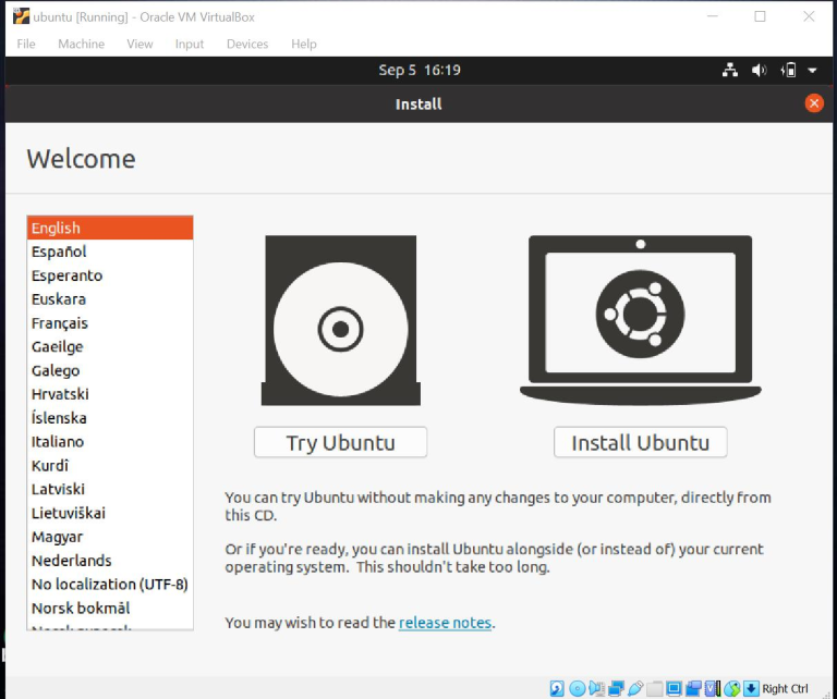Disini anda dapat mencoba ubuntu tanpa melakukan perubahan apa pun pada komputer atau jika anda sudah siap, anda dapat menginstal ubuntu bersama sistem operasi anda saat ini. Disini ya amemilih untuk instal ubuntu dengan pilihan bahasa inggris.