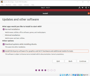 Diberikan opsi penginstalan dan opsi yang lain. Disini saya memilih penginstalan normal dan saya centang downlad update dan install third-party. Klik continue untuk melanjutkan.