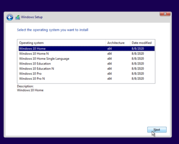 Disini diberikan opsi sistem operasi yang ingin di install. Saya memilih windows 10 Home untuk versinya. Kemudian klik "next".
