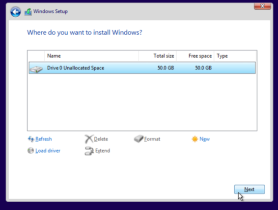 Disini diberikan opsi drive mana yang ingin di buat untuk penginstalan windows. Pilih drive yang ingin dibuat untuk installing windows kemudian klik "next" untuk melanjutkannya.