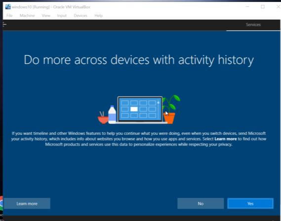 Jika kamu ingin timeline dan fitur lain dari windows maka bisa memilih opsi yes untuk melanjutkannya. Jika tidak ingin maka pilih opsi no dan melanjutkannya.