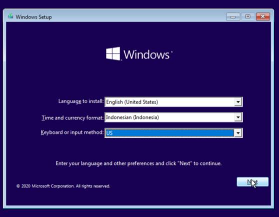 Muncul dialog customisasi. Disini anda bisa memilih opsi bahasanya, waktu daerah masing-masing, dan metode inputan keyboardnya. Apabila sudah selesai memilih, bisa klik next untuk melanjutkan ke tahap berikutnya.