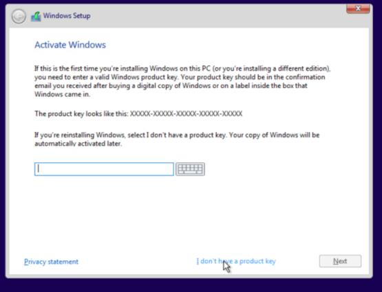 Pada tahap ini, anda bisa melakukan penginstalan windows dalam versi trial, sehingga untuk melanjutkannya klik I don’t. Apabila anda memiliki produk key nya bisa diisi dan kemudian klik next.
